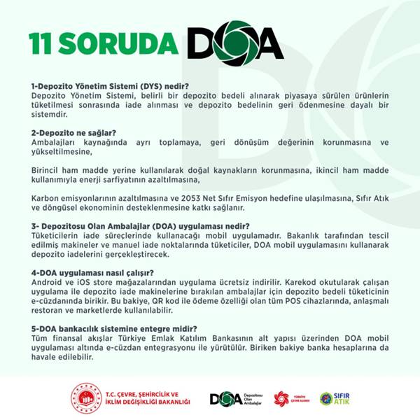 Çevre, Şehircilik ve İklim Değişikliği Bakanı Murat Kurum, Türkiye Odalar ve Borsalar Birliği Başkanı (TOBB) Başkanı Rifat Hisarcıklıoğlu, Türkiye Esnaf ve Sanatkarları Konfederasyonu (TESK) Başkanı Bendevi Palandöken ve Türkiye Çevre Ajansı (TÜÇA) Başkanı Prof. Dr. Ferhat Pirinççi, hafta başında DSYS’nin faaliyetlerini tek çatı altında toplayacak şirketin kuruluş protokolünü imzaladı.VATANDAŞA TEŞVİK BEDELİ ÖDENECEKEmine Erdoğan himayesindeki Sıfır Atık Hareketi’nin yeni bir adımı olacak depozito sistemi sayesinde piyasaya sürülen zorunlu depozitoya tabi içecek ambalajların tüketilmesi sonrasında iade alınması ve vatandaşa teşvik bedeli ödenmesi sağlanacak. Depozito bedeli vatandaşın e-cüzdan hesabına iade edilecek. Bu bakiye, QR kod ile ödeme özelliği olan tüm POS cihazlarında, anlaşmalı mağazalar, restoran ve marketlerde kullanılabilecek. Biriken bakiye banka hesaplarına transfer edilebilecek.