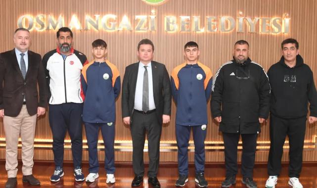 Bursa'da Osmangazi Belediye Başkanı Erkan Aydın, Sırbistan’da düzenlenecek Gymnasium U15 ISF Dünya Şampiyonası’nda Türkiye’yi temsil edecek olan Osmangazi Belediyespor atletizm sporcuları Yağız Çorlak ve Muhammed Esad Ayna’yı makamında ağırladı. Başkan Aydın, madalya mücadelesi verecek milli sporculara başarılar diledi.