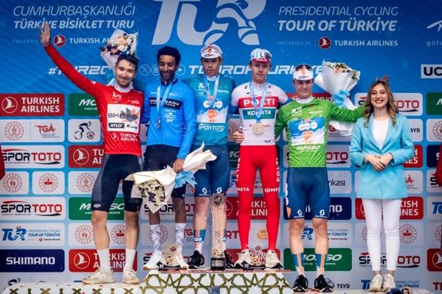 İSTANBUL (İGFA) - 59.Cumhurbaşkanlığı Türkiye Bisiklet Tur'unun 105.4 kilometrelik İstanbul-İstanbul etabı hava muhalefeti ve yağan yağmurun parkuru kayganlaştırması nedeniyle koşulamadı. Bisikletçiler (Nötrölize) yarış dışı olarak İstanbul'da Tur atıp etabı tamamladılar. Yarışın Genel Ferdi Şampiyonu, Yeşil Mayo, Kırmızı Mayo ve Beyaz Mayo sahipleri dünkü sonuçlar geçerli olmak üzere tescil edildi. TUR'UN ŞAMPİYONU BROEK Geçtiğimiz Pazar günü Antalya-Antalya etabı ile start alan ve 8 gün boyunca 1.188 kilometre yol kat eden bisikletçilerin bu yoğun mücadelesi İstanbul'da noktalandı. Tur'u DSM-Firmenich Takımı'ndan Frank Van Den Broek kazandı ve 2024'un şampiyonu olarak Turkuaz Mayo'nun ebedi sahibi oldu. İkinciliği Terengganu Takımı'ndan Kudus Merhavi, üçüncülüğü de Polti Kometa Takımı'ndan Paul Double kazandı. Beyaz ve Kırmızı Mayoları da Bike Aid sporcusu Vinzent Dorn elde etti. Sprint Mayo'sunu ise yine DSM-Firmenich Takımı'ndan Tobias Andresen elde etti. Takım halinde şampiyonluğu da Q.36.5 Pro Cycling kazandı. Tur sonunda mayolar sahiplerini buldu. GENEL KLASMAN (TURKUAZ MAYO)