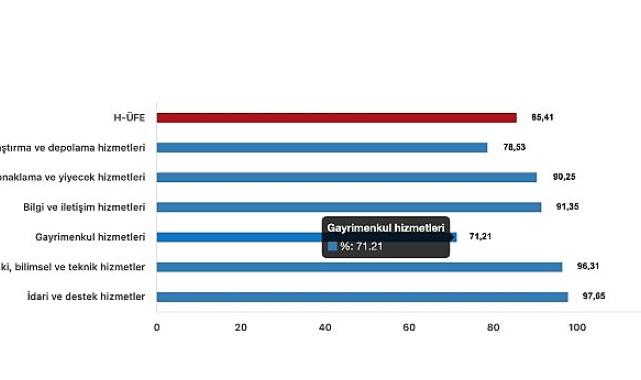 Bir önceki yılın aynı ayına göre, ulaştırma ve depolama hizmetlerinde %78,53 artış, konaklama ve yiyecek hizmetlerinde %90,25 artış, bilgi ve iletişim hizmetlerinde %91,35 artış, gayrimenkul hizmetlerinde %71,21 artış, mesleki, bilimsel ve teknik hizmetlerde %96,31 artış, idari ve destek hizmetlerde %97,65 Artış gerçekleşti.H-ÜFE ulaştırma ve depolama hizmetlerinde aylık %2,86 arttıBir önceki aya göre, ulaştırma ve depolama hizmetlerinde %2,86 artış, konaklama ve yiyecek hizmetlerinde %3,68 artış, bilgi ve iletişim hizmetlerinde %2,80 artış, gayrimenkul hizmetlerinde %3,16 artış, mesleki, bilimsel ve teknik hizmetlerde %6,37 artış, idari ve destek hizmetlerde %4,56 artış gerçekleşti.