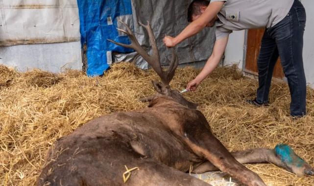 İzmir’in Kemalpaşa ilçesinde bir fabrikaya giren yaralı kızıl geyik, İzmir Büyükşehir Belediyesi Doğal Yaşam Parkı’nda tedaviye alındı. Ateşli silahla sol ön ayağından vurulduğu ve ayağında kırık olduğu tespit edilen geyik operasyona alınacak.